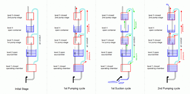 - El segundo ciclo bombeo se produce una vez que el mecanismo del gatillo se vacía y restablece, cierre la válvula de pie y abriendo la válvula de entrada vinculada, haciendo que la cámara de operación llenar, presurizar nuevamente las latas cerradas. Ahora puede considerarse la salida de agua de la parte superior etapa de bombeo.