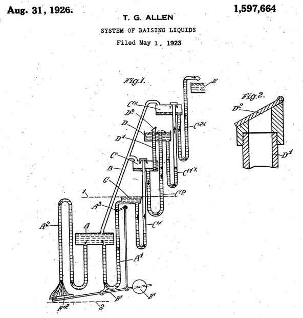Referencia el diagrama de la patente, el sistema utiliza la presión de la corriente de entrada de agua en una cámara cerrada llamada la operación cámara, para bombear agua en los compartimientos cerrados C y Cx hasta el siguiente nivel.
