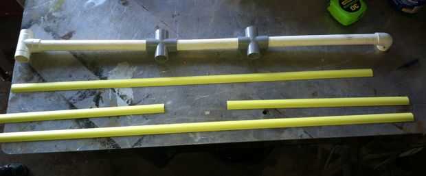 Montar el tubo para formar el marco ("boom") de la antena. Pegar cada pieza, 17 1/2" pieza se conecta entre el tee y el primer cruce. La t de PVC es el frente de la antena. 7" pieza se conecta entre las camisetas primeras y segunda.