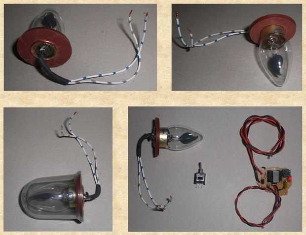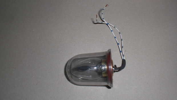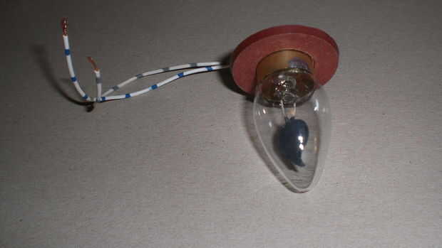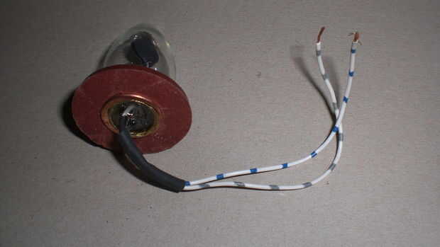 El conjunto "nuevo foco" se encuentra ahora en medio de una placa de fibra vulcanizada roja que tiene en la tapa. Fijar la bombilla con algunas manchas de resina en la parte trasera.