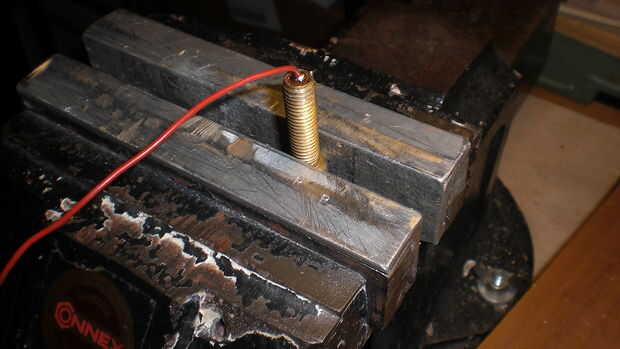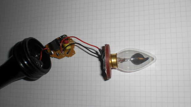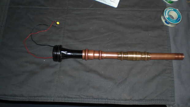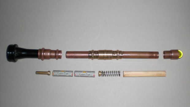 Como fuente de alimentación la antorcha funciona con dos pilas AA en el cobre y el tubo de cobre. Los dos contactos están hechos de latón tornillos y un muelle. Un pedazo pequeño de madera Mantenga las pilas en la posición correcta dentro del tubo de cobre.