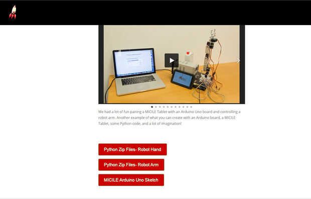 Usando la misma configuración (fuente de alimentación de 5V DC, MICILE tableta, placa Arduino Uno y Arduino Sensor escudo) utilizado para la mano de robot, trate de conectar el brazo robot en lugar de otro. Montar el equipo correctamente según las instrucciones del fabricante. Hay cinco servos incluidos en el kit. Deben etiquetarlos para que coincidan con los números en la placa de Arduino que se conectar a. Etiquetado mina "3" (garra para abrir y cerrar), "5" (garra para girar), "6" (muñeca), "9" (codo), "10" (hombro) y "11" (brazo a girar). Puedes ver qué números utilizamos marcando el código Python que utilizamos. Encontrarás este código en la Página Web MICILE. Pulse el botón que dice "Python Zip archivos - brazo Robot" (se muestra en la imagen de arriba). Esto descargará el código a su archivo de descargas.