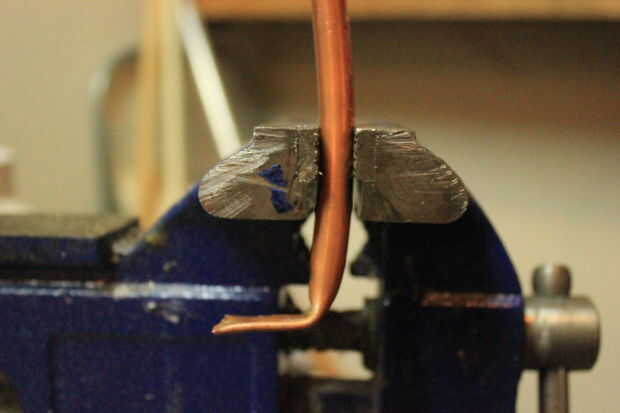 Después de esto el resto del tubo de la abrazadera en el tornillo de banco y hacer dos dobleces más de 90 grados al creat una taza como manija. Tenga en cuenta hasta qué punto el mango debe salir para acomodar los dedos y hasta qué punto debe ir hacia abajo para acomodar los dedos. Longitudes de asa de la taza fueron alrededor de 2 pulgadas y que adapta a mis dedos como una taza de té.
