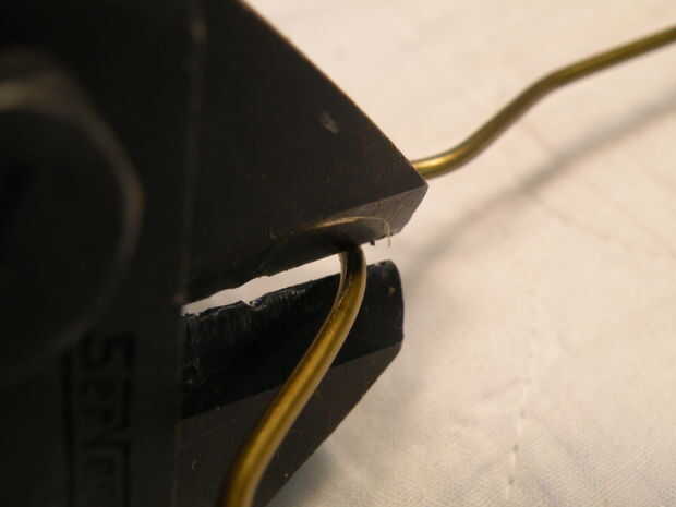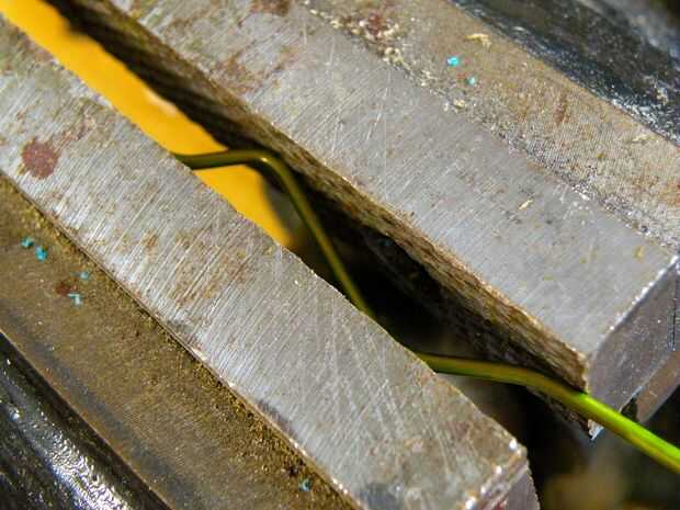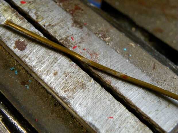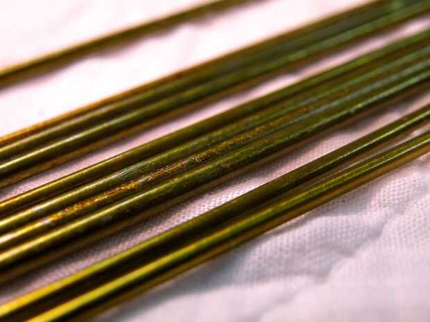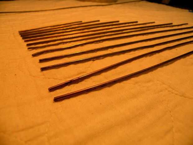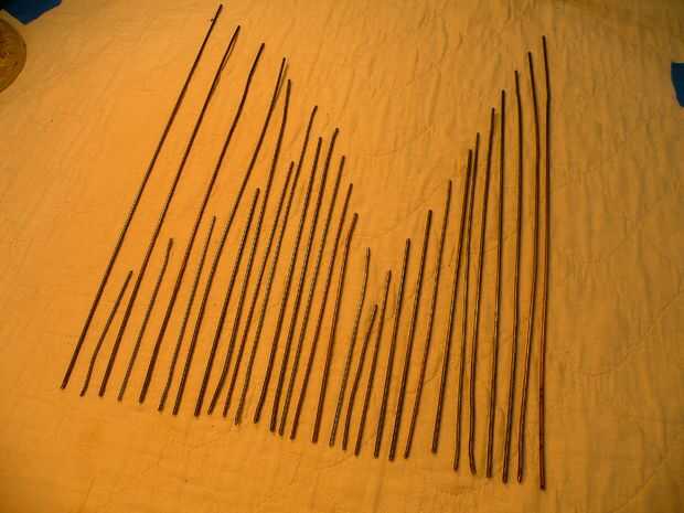 Así, primero medir y cortar las cañas de diferentes longitudes. Sugiero con intervalos incluso entre cada varilla. Por ejemplo, en mi Aquaharp, cada varilla es ya sea media pulgada o 1,5 pulgadas de distintas longitud de la junto a ella. El número de varillas necesarias es igual a la circunferencia del pastel pan en pulgadas. Si está usando ganchos como hice yo, use el Cortapernos a picarlos en tramos rectos antes de que usted puede completar este paso. Una vez que se cortan sus cañas, sepárelos.