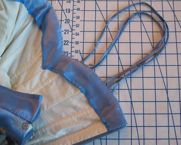 Decidí que una guarnición era necesaria asegurarse de que el TIC-TAC del corselette color crema no muestra el borde superior. Sacó la blusa piezas de muselina y creó un frente. El centro de la espalda se cortó en la tapa para eliminar el bulto extra.