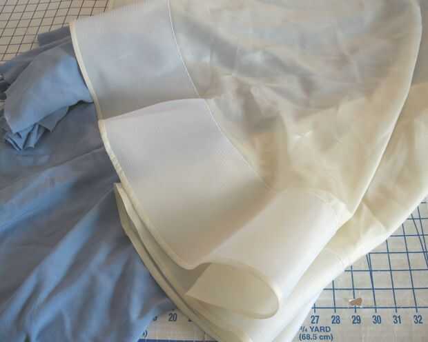 Mientras que de pie en un taburete para que el vestido podría colgar hacia abajo sin obstrucción, marqué donde la guarnición golpeó el suelo con muchos pasadores. Una vez en esta línea de pines, me utiliza un lápiz de tiza para marcar esta línea y mide un par de pulgadas más alto. He usado casi 6 yardas de 6" ancho crin y coloca el borde inferior a lo largo de mi nuevo dobladillo.