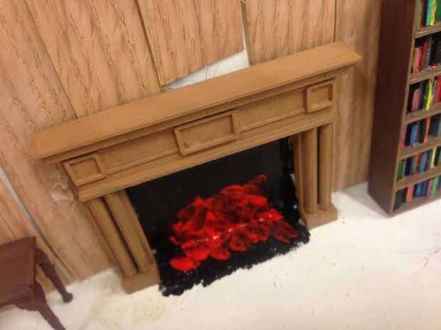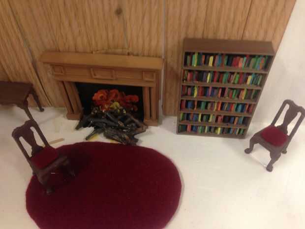 El tamaño original de estos fueron lo suficientemente pequeños (menos de 2 pulgadas) para que los impresos sin ajustar el tamaño. Después de que hayan secado bien, pintarlas con marrón, arena pintura marrón y negra mezclada juntos. Esto se hizo con el fin de hacerlos parecer barnizado. Luego pintamos los otra vez con polar pintura para aplicar una capa adicional. Además, atamos la tela de fieltro rojo en las sillas para imitar un cojín. Utilizamos el mismo fieltro para hacer una alfombra delante de la chimenea.