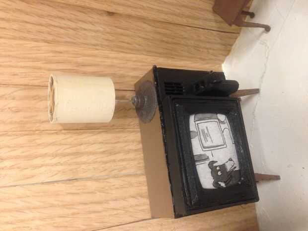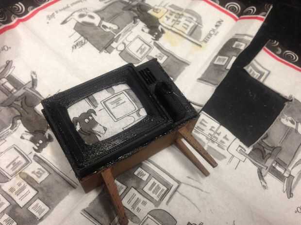 Descargar el. STL archivo y pintar antes de la fabricación. Hemos coloreado el cuerpo del televisor con la pintura marrón y negro. Por suerte encontramos una servilleta interesante, que tiene un dibujo animado. La cortamos para que el tamaño de pantalla de TV y todos los componentes fabricados. COMO usted sabe, Thomas Edison vivió en el siglo XVIII y murió en 1931. La TV blanco y negro fue inventada en 1926. En 1929, la BBC emitió su primer show a través de la TV blanco y negro. Es muy probable que antes de Edison murió que era capaz de experimentar la televisión. Este es otro huevo de Pascua que gente se dará cuenta es fuera de lugar en esta escena.