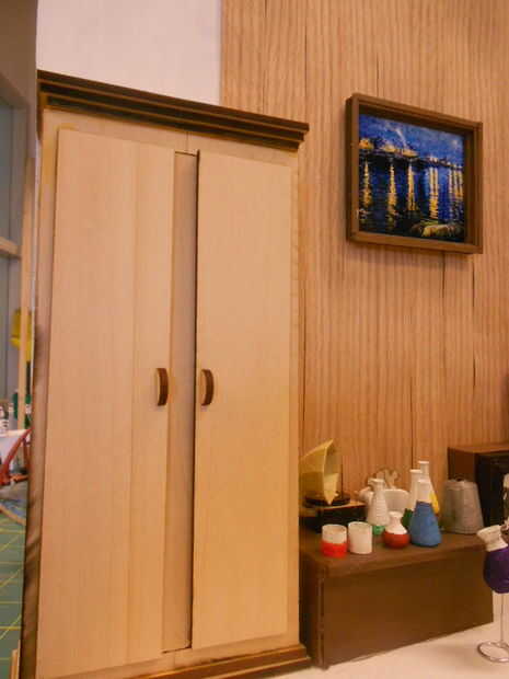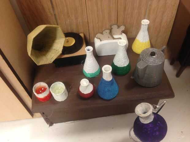 Láser de corte de 1/4 de pulgada de madera bajo para hacer una tabla y luego nos reunimos con pegamento de madera. Según los componentes que desea poner sobre la mesa, el tamaño de la tabla será diferente. Desde que Edison inventó una lámpara, gramófono, tostadoray coffepot, hemos impreso todos aquellos objetos pequeños con una impresora 3D. Luego recortamos un pequeño círculo de acrílico negro con un cortador láser y luego nos pegamos papel amarillo pequeño en él para hacer un disco en el gramófono. Uso 1 pulgada por 1 pulgada de madera para hacer el cuerpo de un gramófono. Imprimir vasos de precipitado, matraces, redondeado frascos por recalcular con diverso tamaño y luego pintarlo así que imita los líquidos químicos dentro de ellos. Especialmente para el vaso, ponemos silicona dentro el vaso después pintamos la mitad del interior de la pared y derrite la silicona con la pistola de calor. Ten cuidado, si calienta demasiado, el cuerpo plástico del vaso se derretir demasiado. Puede entonces hacer un soporte de matraz con alambre y después cuelgue el matraz en él.