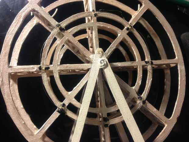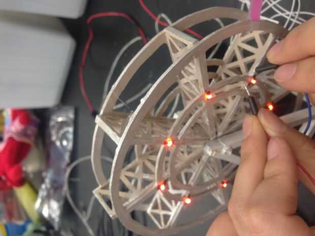 Señaló a la plantilla de una rueda ferrys con google sketchup, exportado como archivo .png 2D, importada a Adobe illustrator y cortar con un cortador láser. Adjunta archivo .ai. Antes de la fabricación de componentes, hacer un todo en el centro de la rueda dejó un alambre para pasar a través de él. Si se conecta la base del triángulo, la rueda gira realmente. Poner LEDs pequeños sobre la rueda y conecte los cables, palillo con pintura conductora. Por último, la rueda ferrys está preparada para conectarse a Arduino.