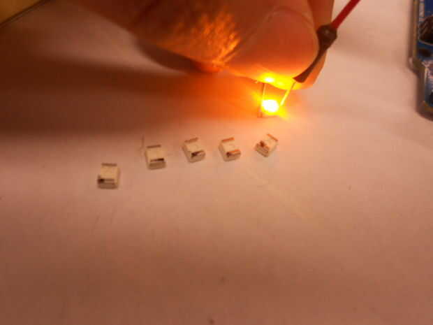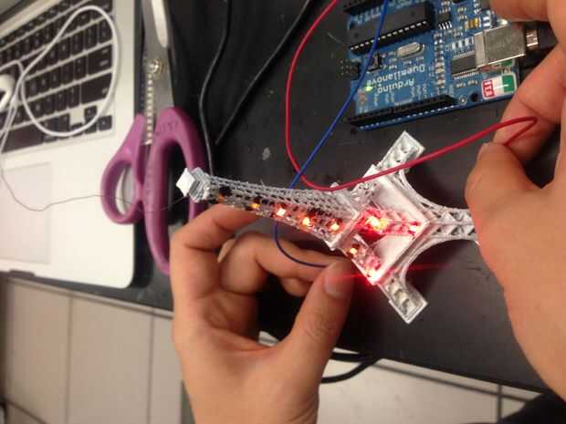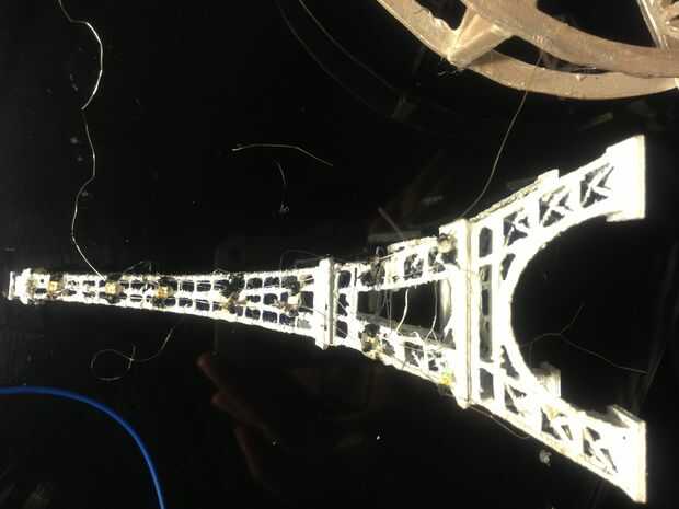 Nos 3D impresos la Torre Eiffel y había pintado con pintura blanca. Poner pequeños SMT LED ' s rojos sobre la superficie de la Torre Eiffel y conecte los cables. Porque el LED es muy pequeño, que necesita mirar hacia fuera que los cables no fije unos a otros. De lo contrario, creará un corto.