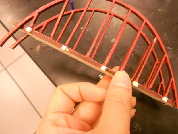 Hicimos cuatro tipos diferentes de puentes. Atamos las plantillas de dos novias de estilo de arco para corte por láser. Para hacer el puente de estilo la puerta, cortar la madera bajo para la parte inferior 1 pulgada por 5.5inches y dos .5inch por 5.5inches para guardia. Cortar un taco de madera cuadrado, para hacer cuatro columnas 3inched, dos 1.5inched. Aquí es una tarea más exigente y quisquillosa que hacer, para hacer el viejo puente de madera envejecida. conectar dos finos, madera plana pegue horizontalmente e instale un pequeño 12.5 pulgadas una pantalla vertical entre la parte inferior del puente y la parte superior.