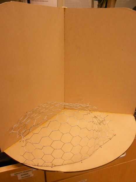 Utilizar 1 'x 1' pedazo de alambre de pollo para formar una colina. Marca en el tablero varios lugares donde puede perforar orificios para fijar el alambre que el alambre de pollo en su lugar.