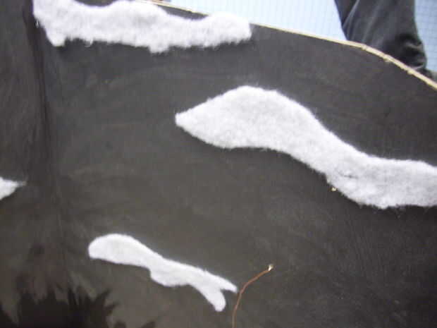 Cortar formas alargada nube de fieltro y pegar al fondo. Utilizamos fieltro cara pegajosa pero usando pegamento caliente y sentía regular está bien.