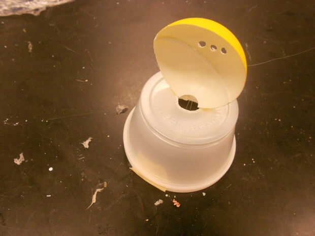 Corte un agujero en la parte inferior de la taza de plástico. Pegamento caliente del hemisferio en el borde del agujero para que la mitad de la ping pong ball se asegura sobre la base de la Copa volcada. Los agujeros deben ser paralelos a la mesa.