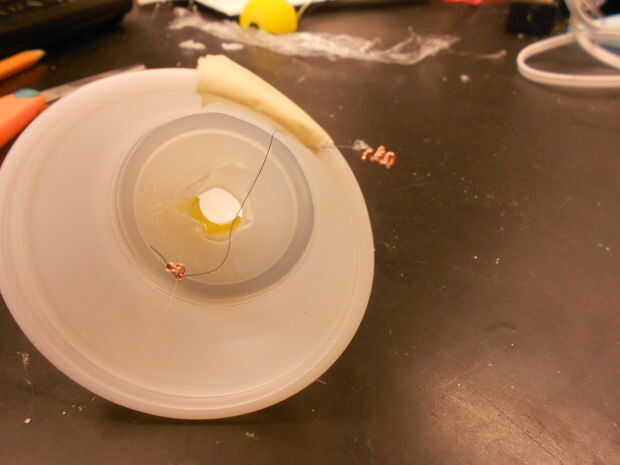 Tomar la pieza de madera de desecho y colocar la taza sobre ella. Marque 2 pares de agujeros (total de 4 agujeros) en la madera a las afueras de lados opuestos de la Copa. Esto es el alambre de cobre un lugar para celebrar el Flexinol hacia abajo firmemente. Desde que el Flexinol no soldadura directamente, tienes usar alambre de cobre para asegurar el alambre muscular.