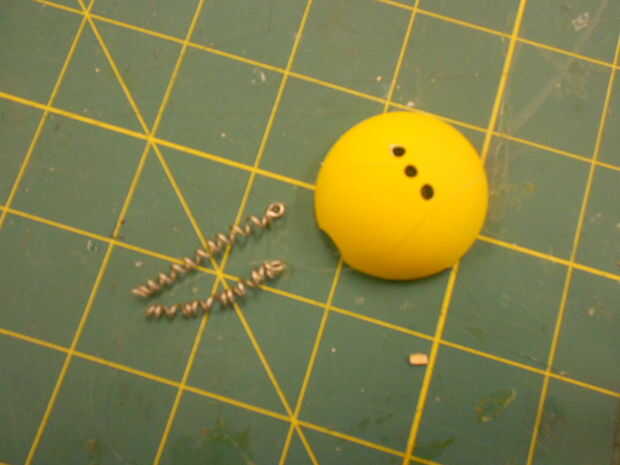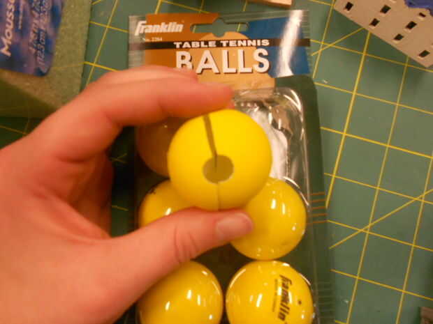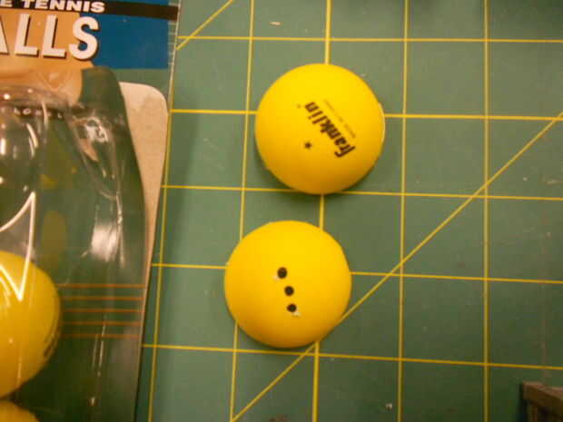 Perfore dos agujeros de unos 3mm una de otra en un lado de la pelotita de ping pong. (Curiosamente, las pelotas de ping pong que pasamos a comprar eran la marca de Franklin. Cómo guarnición.) También Perfore un agujero grande en la parte inferior de la bola. Corte la pelotita de ping pong en medio, asegurándose que los orificios estén alineados horizontalmente en el centro del hemisferio.