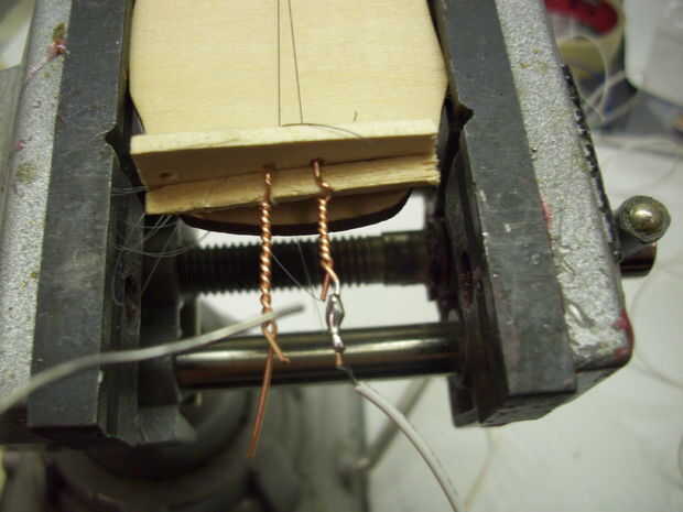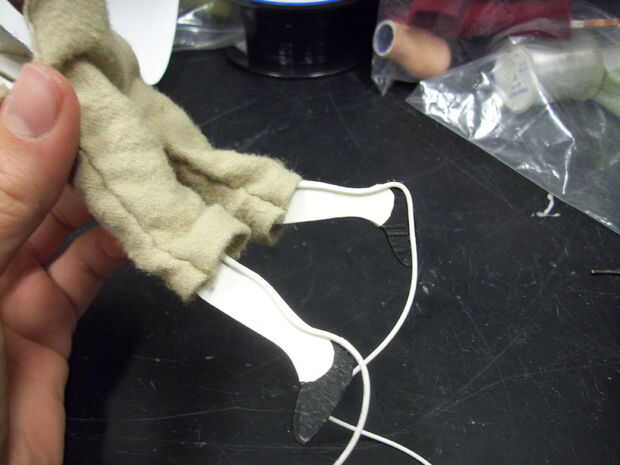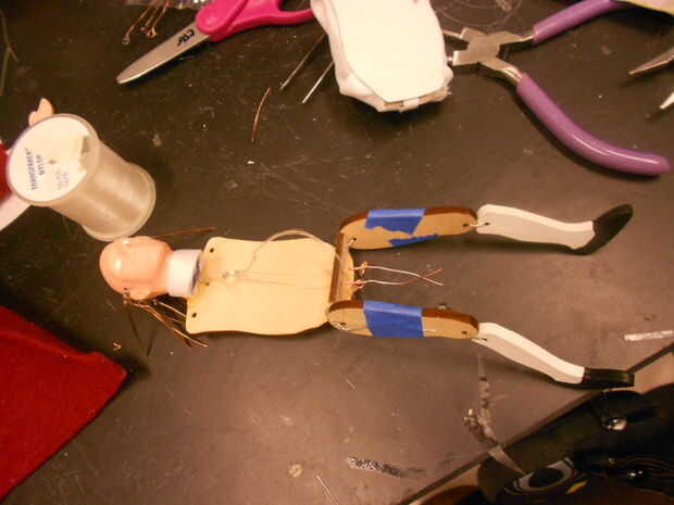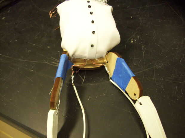 Ahora que ya tenemos los alambres de cobre conectado al Flexinol y atado al torso, soldarlos a dos hilos blancos largos. Estos cables deben ser capaces de llegar a en la colina y por la parte posterior de la escena, tan medida en consecuencia. Poner pantalones de Franklin sobre las piernas, asegurándose de tener un cable en cada pierna del pantalón.