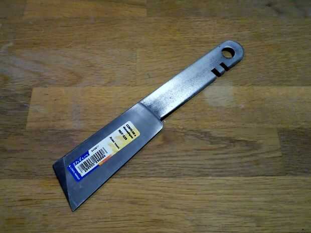 Hace unos años un amigo me dio un par de llaman 'cuchillos de Cristalerías' (no sé si eso es realmente el nombre correcto) - cuchillos forjados que podrás encontrar en cada tienda de bricolaje, utilizado para quitar la masilla ensambladura de windows. Son baratos, de acero al carbono de espesor y tienen un bonito agujero en el mango.