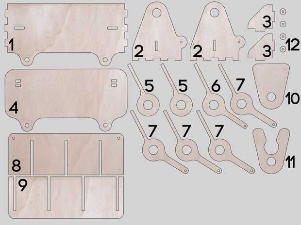 • Realizamos nuestras piezas con un espesor de 5 mm, pero puede usar múltiplex más grueso. Cuando se utiliza el múltiplex más grueso, necesita adaptar nuestros archivos a otro espesor.