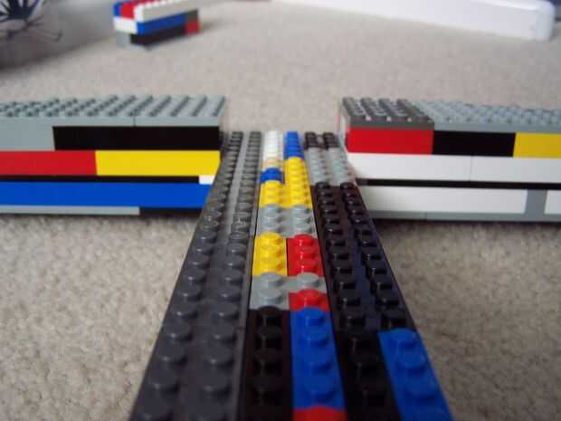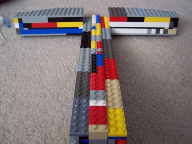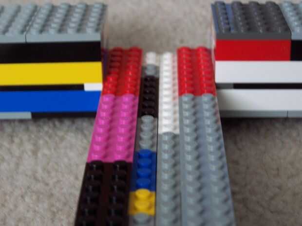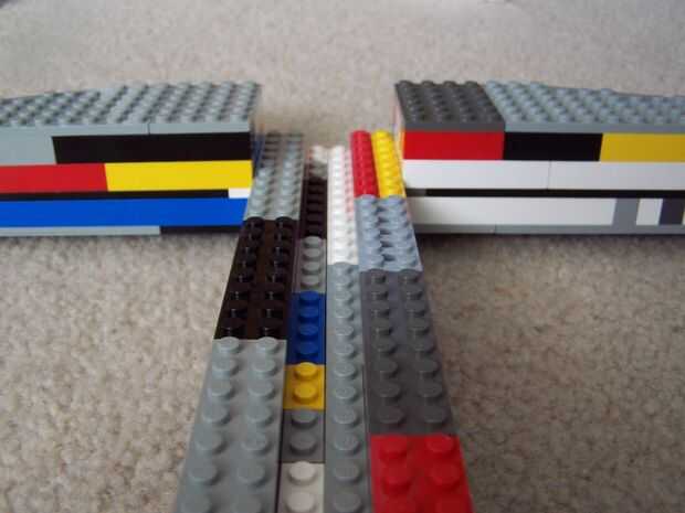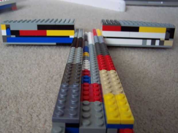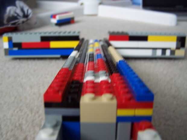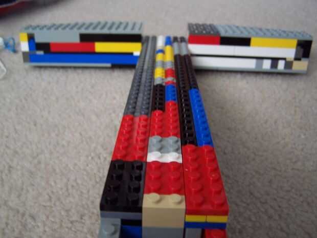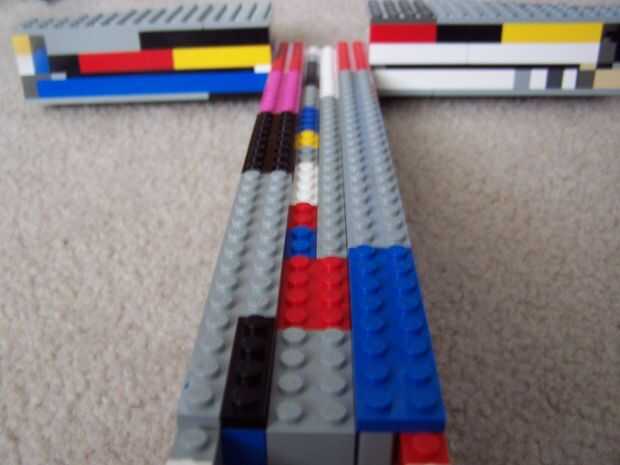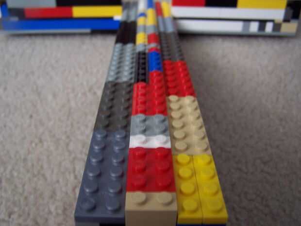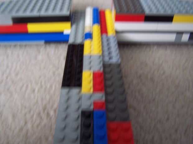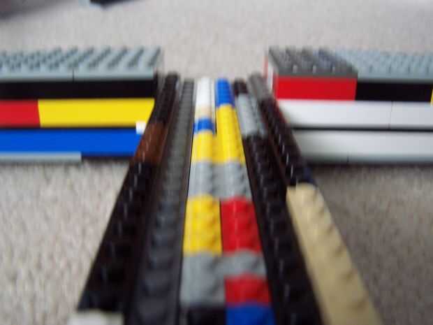 .Paso 1: Consiga dos 1 x 16 ladrillos con agujeros en ellas y poner azulejos de más de 11 postes de madera en cada ladrillo.Paso 2: Sujete.Paso 3: Haz dos 1 x 6 ladrillos con agujeros y colocar conectores técnica 7 en los orificios mostrados.Paso 4: