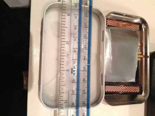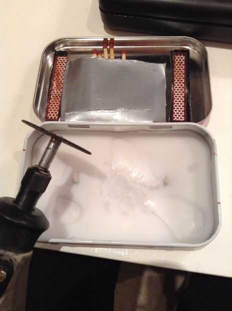 Utilizando una regla marca el cuatro lugar donde usted cortará los agujeros para sostener su "parrilla". Debe haber dos en cada lado, y deben ser frente a la unos a otros. Puede utilizar una dremel para cortar las ranuras. Asegúrese de que usted corte los agujeros profundos para que usted todavía puede cerrar la lata una vez haya instalado la parrilla.