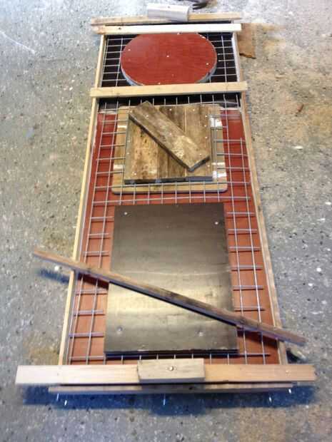 La barra de refuerzo se hace de una jaula de perro viejo. Los agujeros más pequeños, más fuerte será. Asegúrese de que no toca la parte inferior del marco de la que será la superficie cuando está completa.