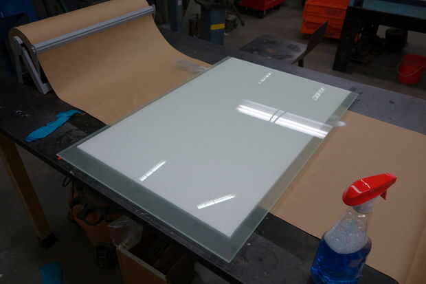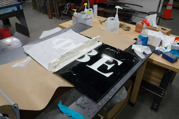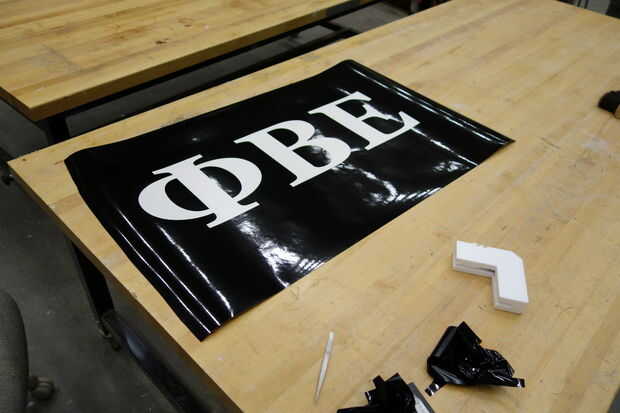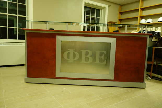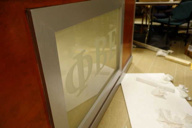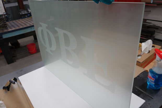 7) tiempo de agregar el vidrio! Usé helando pintura en aerosol para cubrir la parte posterior del vidrio con el Phi Beta Epsilon y luego, usando una plantilla hecha en una cortadora de vinilo, grabado al agua fuerte PBE en la parte delantera. El cristal entonces fue atado a la moldura con un simple marco de acero que soldados y algunos silicona para mantener en su lugar.