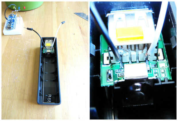 Conecte cables de puente a la + positivas y - negativas las patas de los puertos USB en el Banco de potencia. Esto es donde tengo mi electricidad. ahora Conecte el cable positivo a la pata del media del interruptor de encendido/apagado y - cable negativo a GND de arduino nano. colocar la otra pata del interruptor a VIN en arduino nano. Ahora puede girar fácilmente me encendido y recarga desde fuera. el Banco de potencia permite recargar fácilmente la maceta.