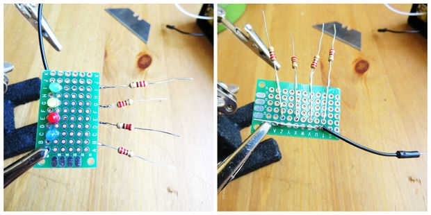 conectar 1 x 220 Ohmios resistencia a la pata positiva de cada LED por separado y luego conectarlos a: