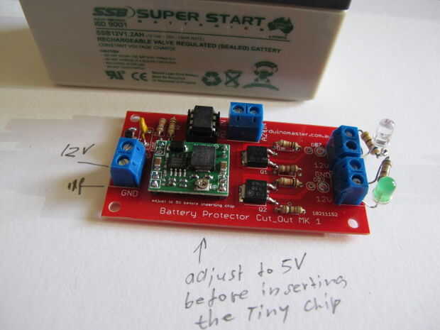 Agregar un retraso más en el código puede reducir el consumo de energía del circuito. Ningún LED que consume energía está en el tablero a propósito. El circuito consume solamente 2 mA con el LED de desconectado y es mejor que el comercial cortó los interruptores que uso 6 mA.