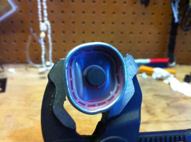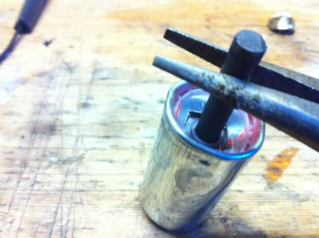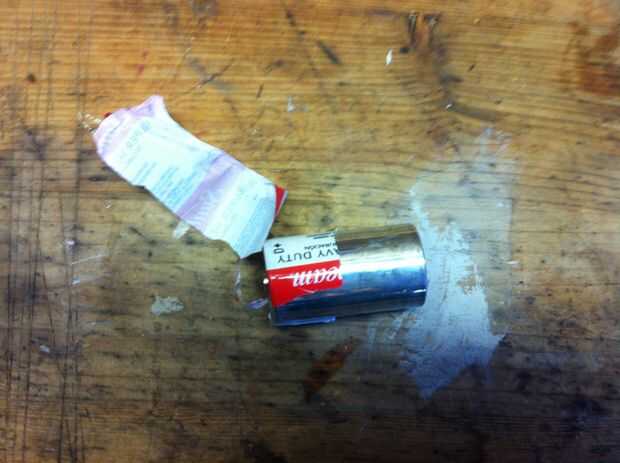 derretir. ahora con las tijeras para alambre, cortar la carcasa de metal. Pelar con unos alicates y retire la tapa del extremo positivo. Si usted no tiene un tornillo de banco necesidad de alicates o tijeras para alambre, esta es la forma más fácil. Poner la batería en el tornillo de banco y empezar a apretar el tornillo de banco. Usando cualquier método expondrá una varilla de carbono negro dentro. En mi batería, había alguna cosa de goma que sostiene la varilla de carbono, así que corte alrededor de la barra con un cuchillo. Ahora tire suavemente de la barra del carbón de la batería. Cuando usted tira de él hacia fuera, puede haber algunas cosas stickey, tan sólo de limpiar con un paño de cocina. Hacerlo mismo con las otras dos pilas.