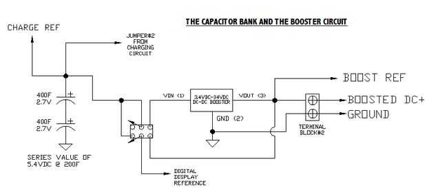 Como se puede ver, tenemos aquí el circuito de banco de condensadores en el lado izquierdo del siguiente esquema. Se compone de 2 x 400 faradio 2.7v condensadores estupendos, aquí: http://cgi.ebay.com/ws/eBayISAPI.dll?ViewItem&item=180566348151