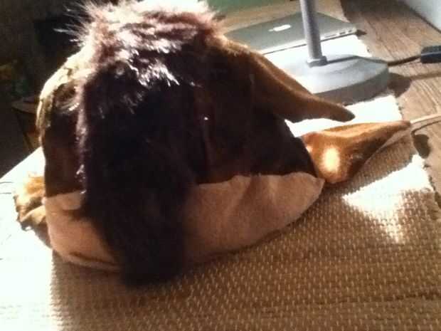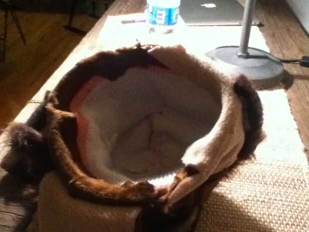 Para la parte del gorro cubrir alrededor de la tela conjunto caramelo caliente pegada (podría coserlo que te recomiendo simplemente no tienen ninguna habilidad de coser alguna) un lado en un momento. Me aseguré de dejar un pequeño espacio por si acaso. Pruebe uno y lo recorte. Poner en el gorro y medir cuánto espacio es necesario rellenar todo con piel de caramelo.