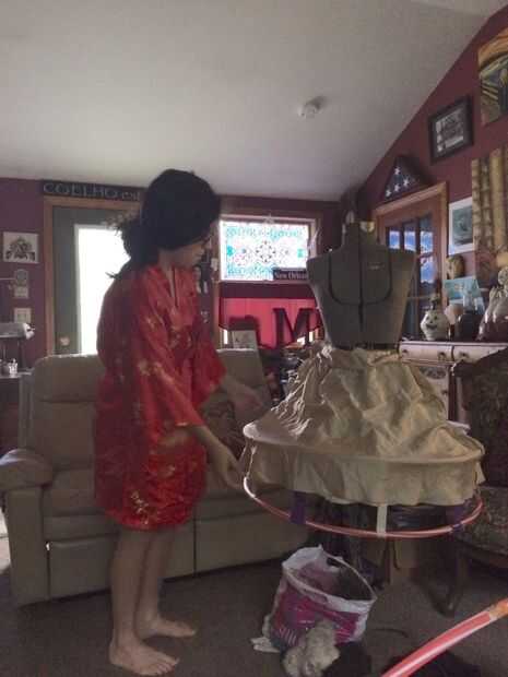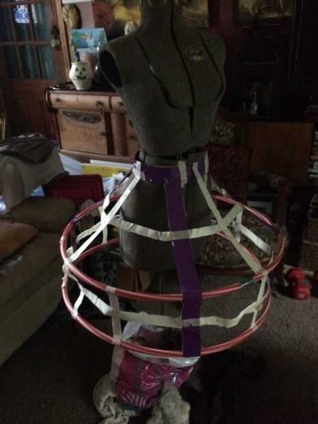 Mide cuánto hacia abajo sentí los aros de hula debe ser. Usando la misma cinta en método de la cinta, graba los aros de hula en el lugar, una mayor primero, asegurándose de que colgaban directamente. Grabado una infraestructura con cinta de enmascarar para fortalecer la forma. En la parte de atrás, tuve una "V" de tiras de cinta a cada lado de donde el cinturón abriría así sería fácil paso en y hacia fuera de.
