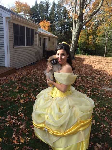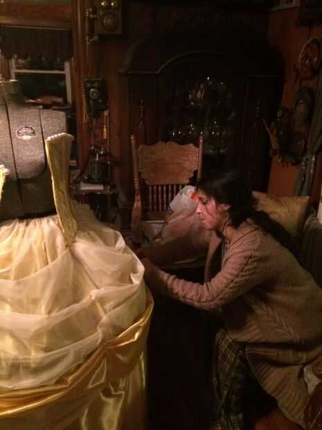 Cosí otra falda hinchada, usando el material de puro oro (vea las instrucciones para la falda I). En lugar de dobladillar, puse la escarpada falda en la parte superior del aro, tutu y amarillo en la forma del vestido. Comencé a agrupar el material puro a partir de la parte superior, trabajar alrededor y hacia abajo. I seguridad cubrió los racimos a la seda amarilla debajo. En caso de no ver belleza y la bestia todos los días, vestido de Belle tiene algo simétrico racimos que van todo el camino hacia abajo de su vestido. Elegir que vaya un poco más de medio camino hacia abajo, tres en la parte delantera y tres en la espalda. Quería ser tan ligero y suelto... como una bola enorme puede ser vestido.
