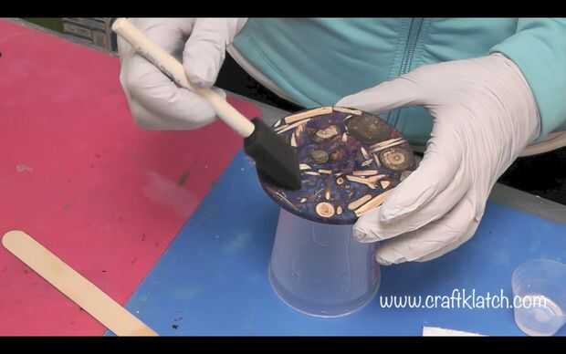 Trabajo sobre papel pergamino o periódicos, mezclar más resina. Usted necesita solamente un poco. Cepille suavemente la resina en la montaña. Asegúrese de que está bien cubierta, pero sólo debe ser una capa fina. Reloj para cualquier goteo.