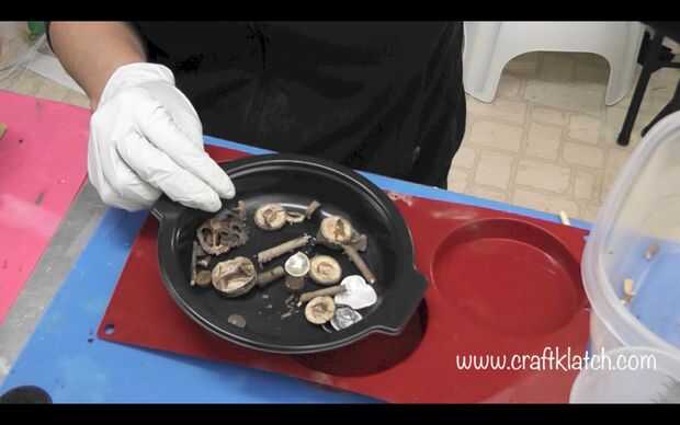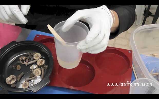 Recoger cosas de la naturaleza. He utilizado palos, ramitas, trozos de madera, secadas de hojas machacadas, pedazos de nueces negras etc.. Preparar la resina según las instrucciones del envase.