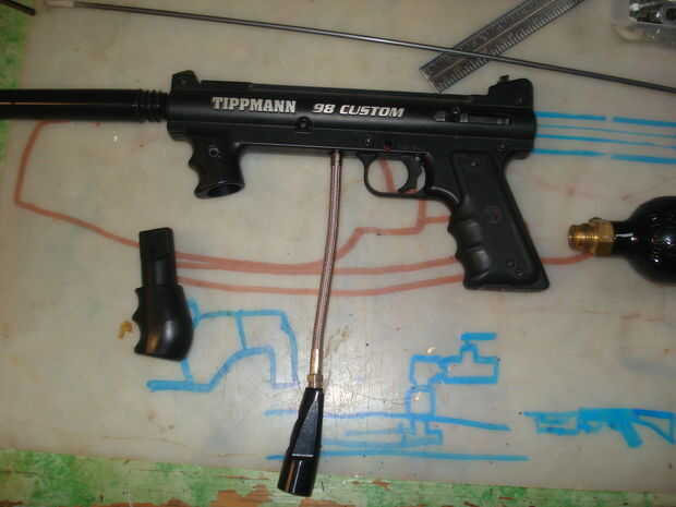 Aflojar los tornillos que sostienen el acoplamiento del tanque y el tubo en la parte inferior de la empuñadura.