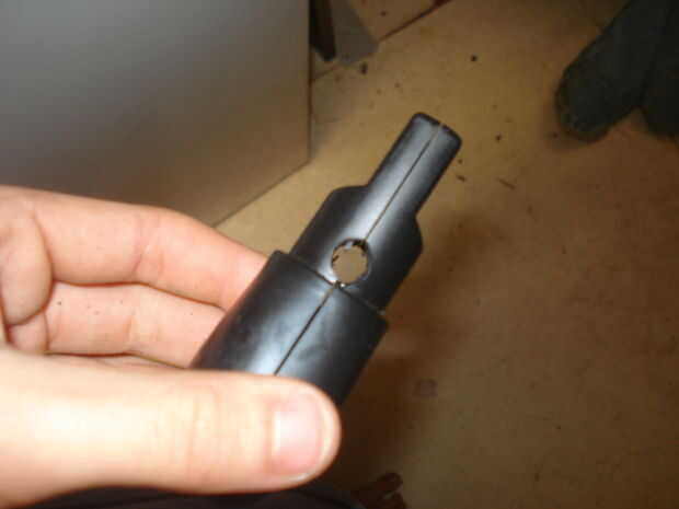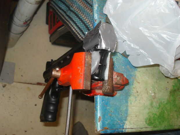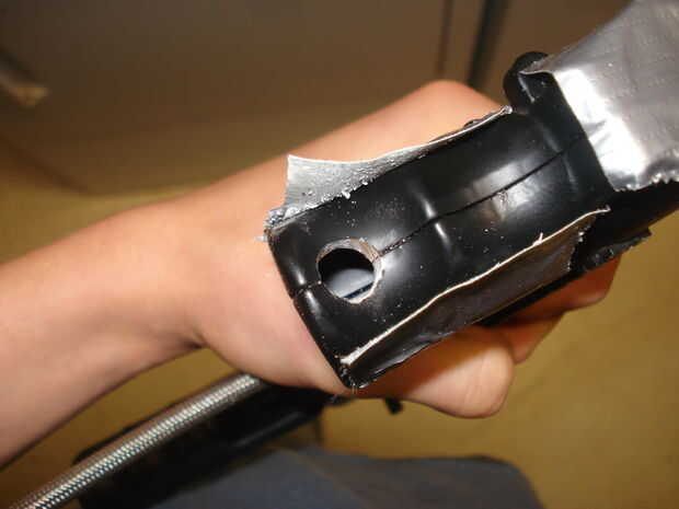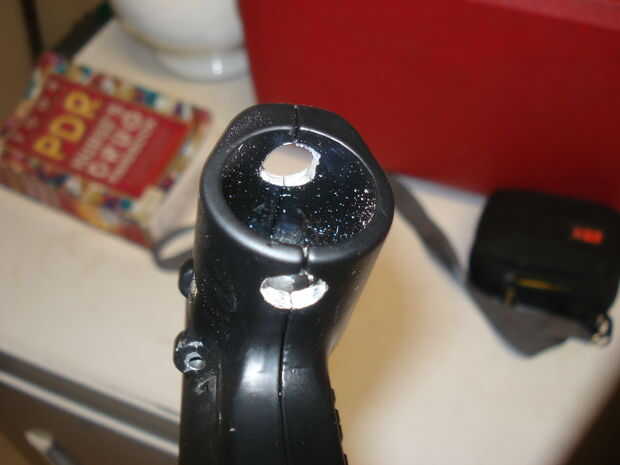 Luego, tomar una broca del mismo diámetro de la manguera de alimentación de gas y perfore un agujero directamente a través del cuerpo de la carcasa empuñadura frontal como se muestra.