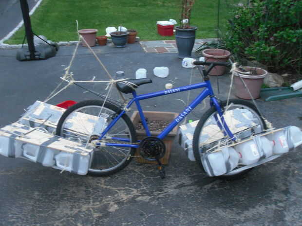 Para la flotabilidad, decidí usar muchas jarras de leche de 1 galón para mantener el costo bajo. Según el principio de Arquímedes, el peso de la cantidad de líquido que se desplaza de un objeto es igual a su flotabilidad. Debido a pesa alrededor de 175 libras y estimado la bicicleta para estar entre 35 y 45 libras, necesito un total de 250 libras de flotabilidad. Se trata de plantillas de 32 galones.