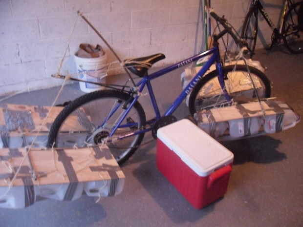 Una de las partes más complicadas de la construcción fue mantener los flotadores mientras que en el agua. Porque alrededor de 250 libras de fuerza va empujando que necesitaba apoyos muy fuertes. Por desgracia sólo tenía postes de la carpa, que eran lo suficientemente fuertes como para mantener sólo la bicicleta boyante. Si había reforzado con postes adicionales, la moto sería capaz de mantenerme también.