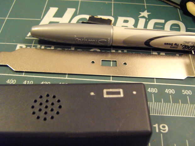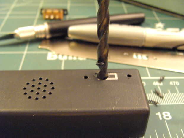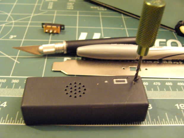 Taladrar los agujeros para los tornillos, luego use un taladro un poco más grande que el interruptor. Hacer dos agujeros en la gran parte de la plantilla de interruptor y limpiar con un cuchillo x-acto.