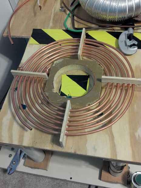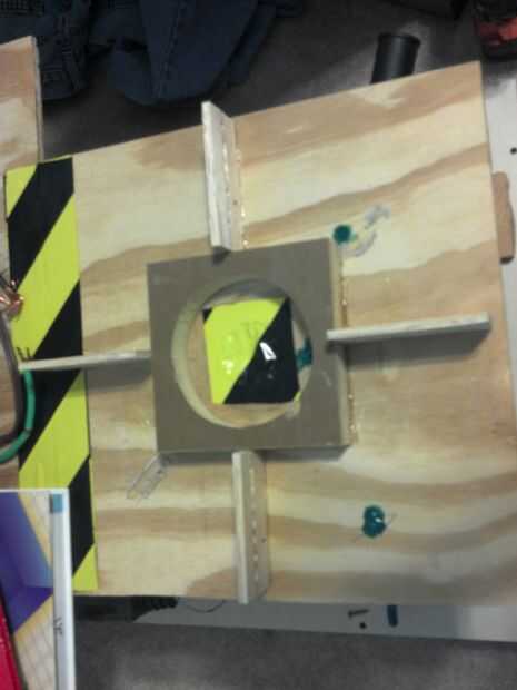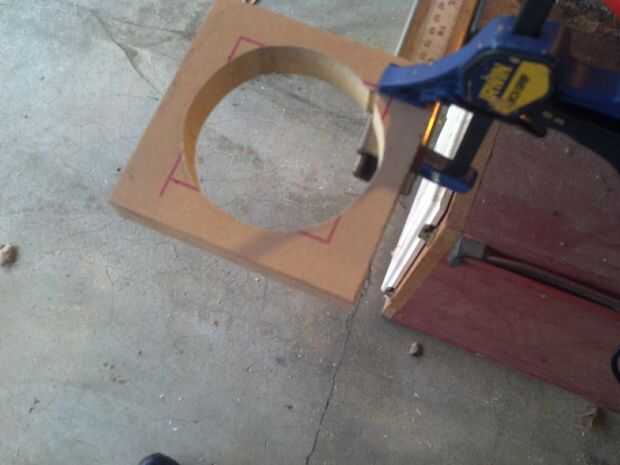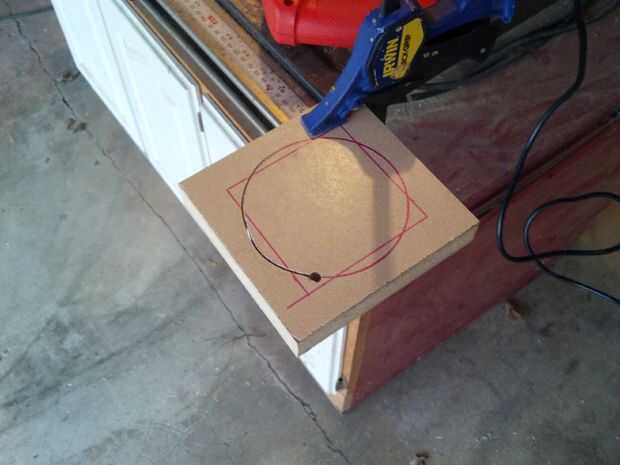 En primer lugar, he hecho un cuadrado de 6 "x 6" de 1" espesor aglomerado, con un agujero en el centro para aceptar la identificación PVC de 4". Lo mejor sería cortar aproximadamente una pulgada de las esquinas, como la bobina no se ajusta con las esquinas de tamaño completas.