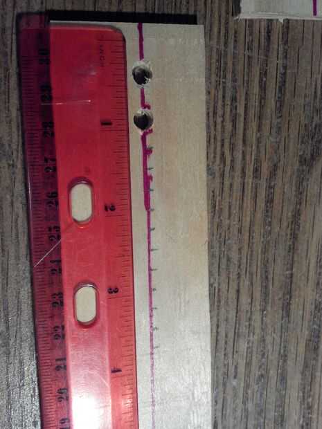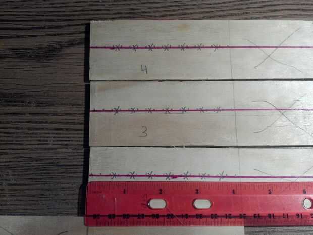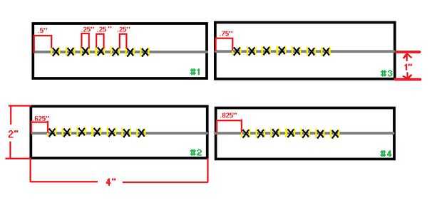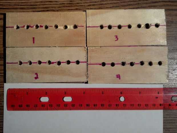 Luego hice cuatro de 2 "x 7" piezas de madera contrachapada. Entonces les marqué 1, 2, 3 y 4. En todos los cuatro pedazos, hice una línea a través de ellas (lateral) 1" de la parte inferior. Pieza 1, hice una marca 0.5" desde el extremo, intersección de la línea horizontal. Procedí a marcar otro 0,75" desde el extremo, 1" del final, 1.25" de la final y así sucesivamente, haciendo una marca cada 0,25" a lo largo de la línea central. Perforar entre las marcas que es una "X". Ver las fotos. En la pieza 2, hizo una marca de 0,625"(1/2" + 1/8") desde el extremo y procedió a hacer una marca 0,25", 0.5", 0,75", y así sucesivamente de la marca. Es el desplazamiento extra 1/16" de la primera marca para asegurar que después de un giro completo, la bobina es. 5" desde que se inició (haciendo una espiral). Otra vez, perfore los espacios marcados con una "X". La serie continúa con principio de la pieza 3 en 0,75" y 4 comenzando a 0,875". Usé una 0,286" diámetro broca. Usar algo un poco más grande que 1/4", como la bobina de cobre 1/4" diámetro interior, el exterior es ligeramente más grande. Prueba a ver si el tubo encaja en los agujeros antes de pegarlos todos juntos.
