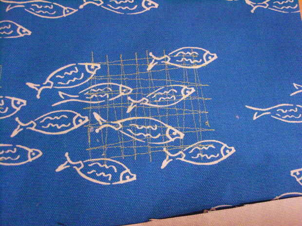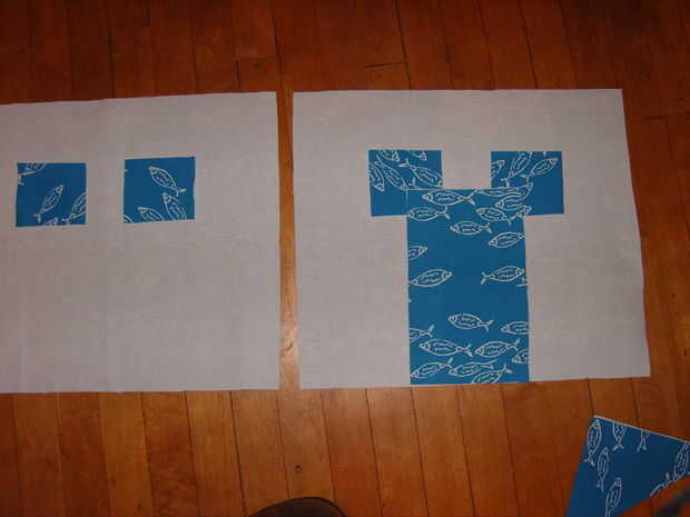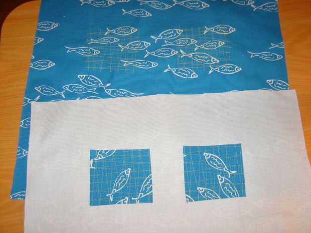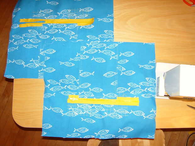 Extienda cada pedazo de lado boca abajo. Laicos el refuerzo mango piezas 2/3 del camino a la cima y con sus centros cada 4" desde el centro de los lados. Precisar las esquinas y les coser luego bien, cose todo, hacia atrás y hacia adelante. Esto se mostrará en la parte delantera, pero si coincide con tu hilo, no muestra mucho. He utilizado un hilo de contraste sólo porque me gusta.