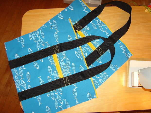 Coloque las correas del corte a lo largo de los lados de la bolsa con los extremos en la parte inferior del lado. Asegúrese de que la parte que forma el mango no está torcida. Coser estos muy sólidamente, desde el fondo hasta unas pocas pulgadas más allá del bolsillo, terminando dentro de la zona reforzada. Preste especial atención a estas áreas superior ya es donde estará la mayor parte de la cepa. Me gusta coser grande x