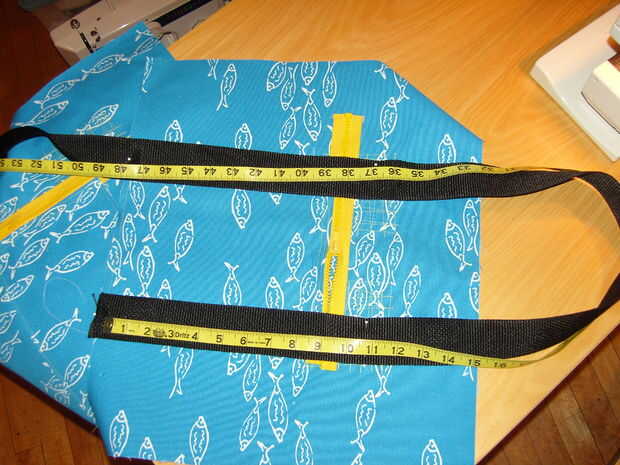 Corte 2 piezas de la correa de nylon ancho, cada uno de aproximadamente 48-60" largo dependiendo de su tamaño del bolso, para las tiras de mango. Antes de cortar, perno el atar con correa y mantenerla hasta imaginar el bolso terminado, así que no hacen las manijas cortas o demasiado largas.