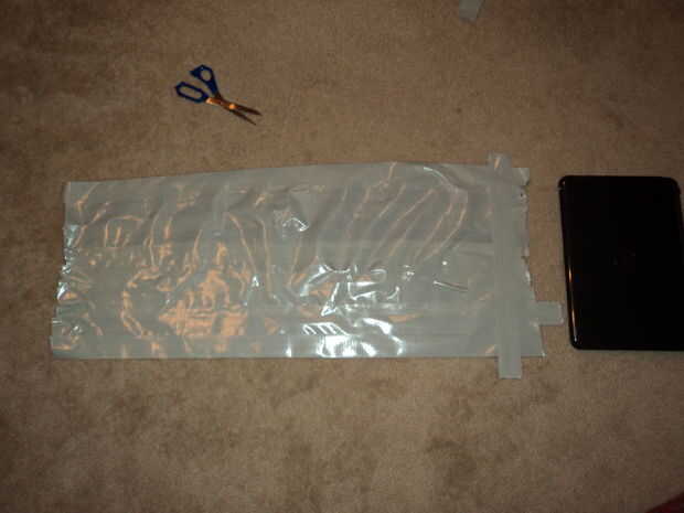 Lo primero que quieres hacer es colocar una lámina de cinta adhesiva que es cerca de 4 pulgadas de largo de doble de la anchura de su ordenador portátil con el lado pegajoso hacia arriba, pero recuerda es mucho más fácil de cortar que a añadir en. Como se puede ver en mi foto accidentalmente hice mi hoja inicial casi 3 veces el ancho de mi portátil, pero arreglaremos más adelante.
