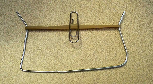 filamento sobre uno de la banda de goma estirada, cerca de la mitad como se muestra. El clip debe estar entre los dos hilos, conectados a uno de ellos.